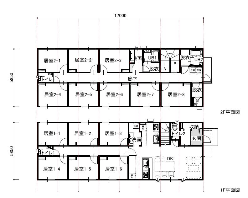 シャワールームも完備し、時間帯を気にせず大人数でも暮らしやすい、機能的な2階建てシェアハウスのプランです。