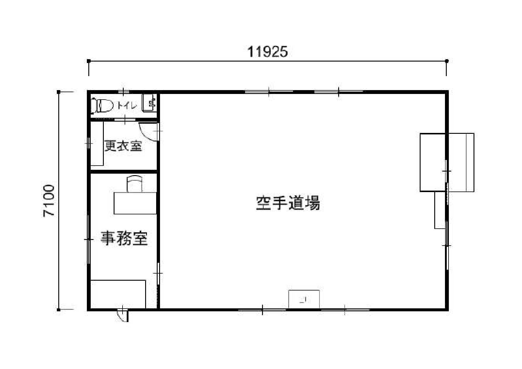 大きなワンフロアの他にも事務所や更衣室、トイレがプランに含まれています。