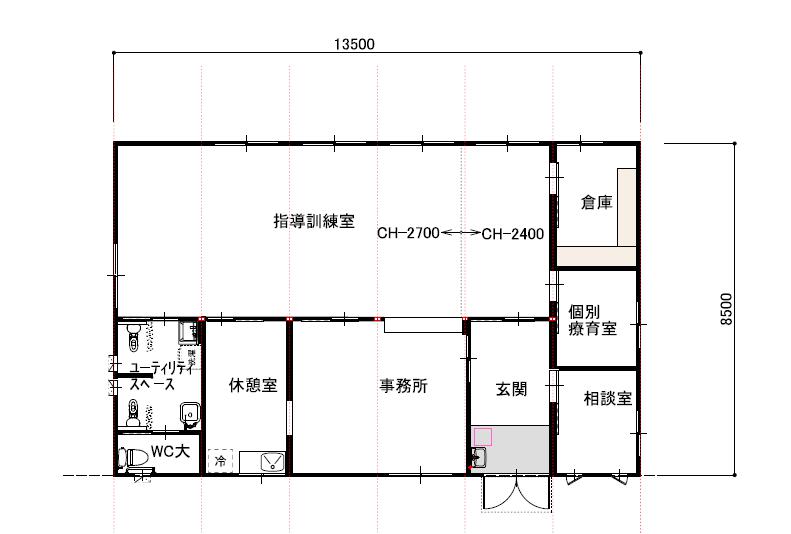 約50㎡の指導訓練室の他、目的に応じた個別の部屋を設けた児童支援施設や放課後デイサービス向けのプランです。