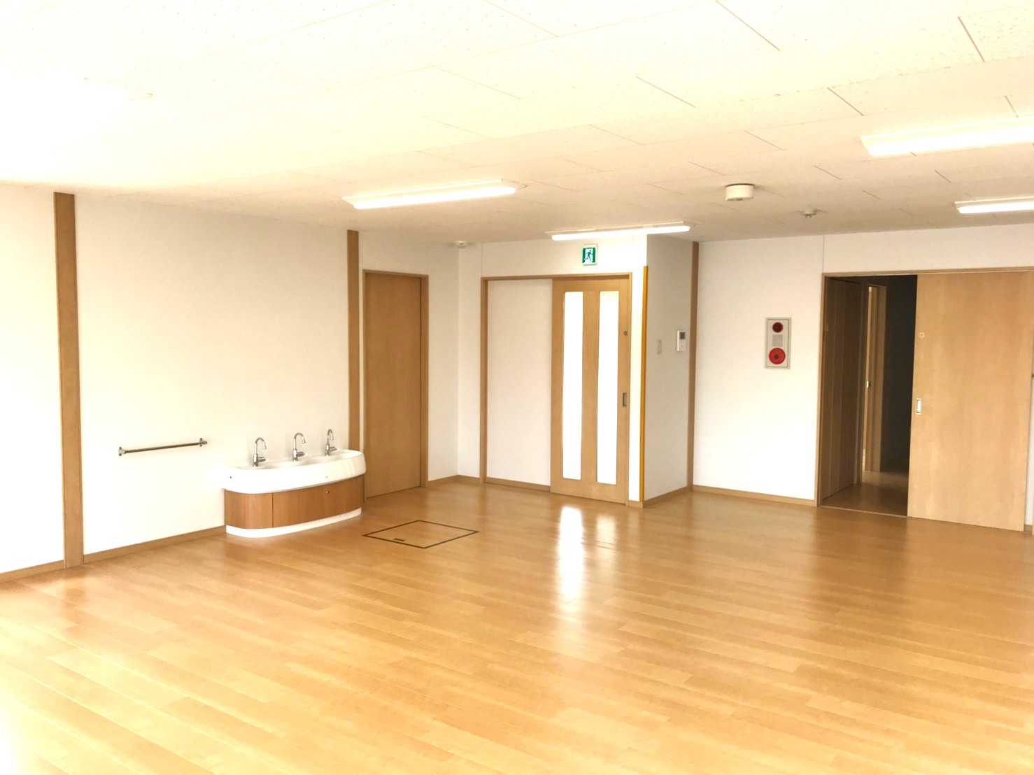 保育室やキッチンスペースの他、幼児用シャワーパンがついたユーティリティールーム等がある、