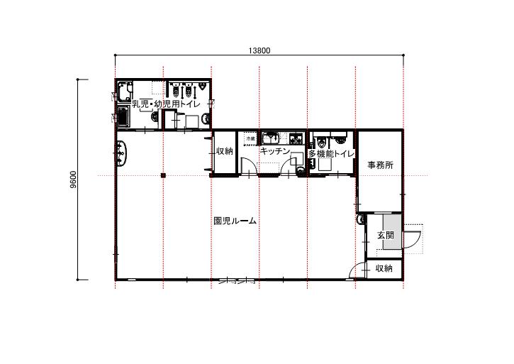 幼児用トイレ・多機能トイレと調理室、事務所付きのプランになります。