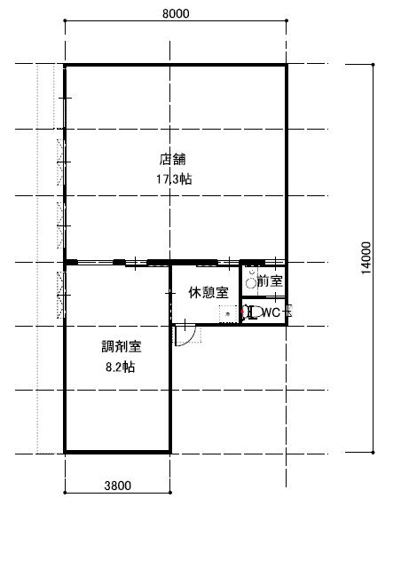 店舗、調剤室、トイレとスタッフ用の休憩室も設けた充実の調剤薬局のプランです。